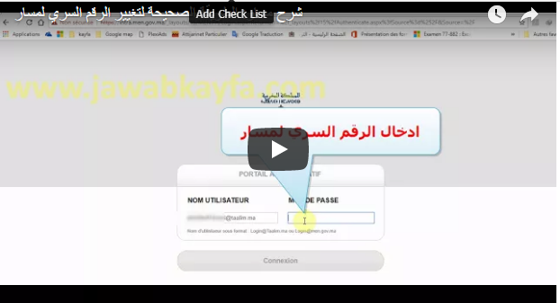 الطريقة الصحيحة لتغيير الرقم السري لمسار الطريقة الصحيحة لتغيير الرقم السري لمسار . الطريقة صالحة لكل مستعملي مسار : المدراء لمختلف الاسلاك و كذا هيأة التدريس. 2017-12-03 kinani شاركها ! tweet